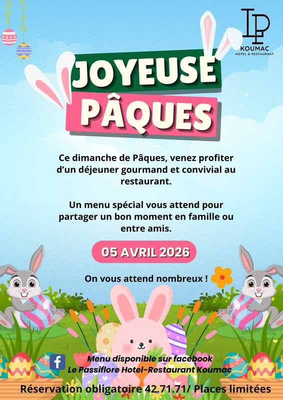 Le Passiflore Le Passiflore, 21 rue Georges Baudoux, KoumacÀ l'occasion de Pâques, on vous invite à partager un moment gourmand et convivial autour d'un menu spécialement préparé pour l'occasion. Toutes les saveurs vous attendent juste en dessous Que ce soit en famille ou entre amis, venez profiter d'un bon repas dans une ambiance chaleureuse et festive Et pour les plus jeunes… Une petite